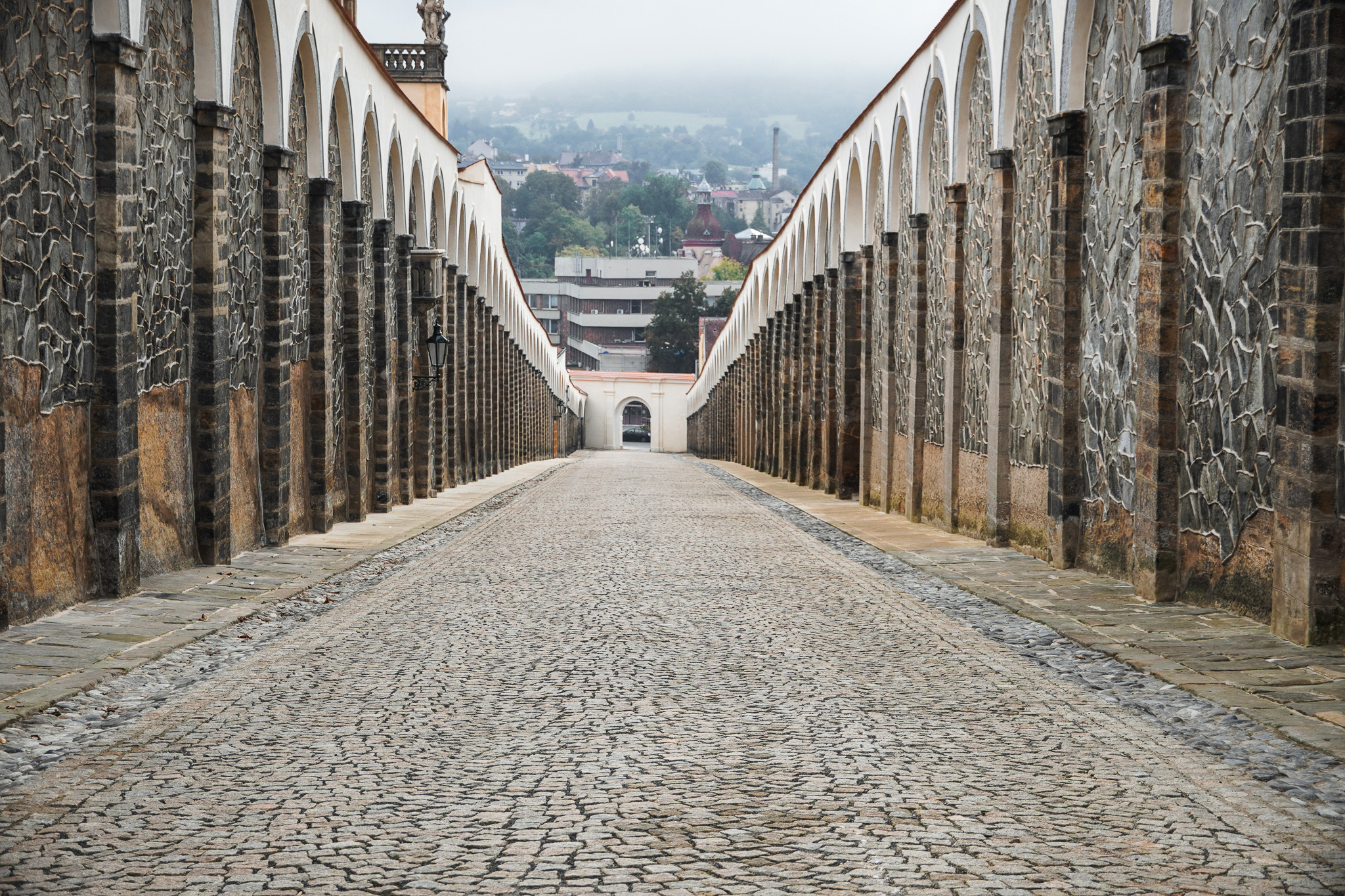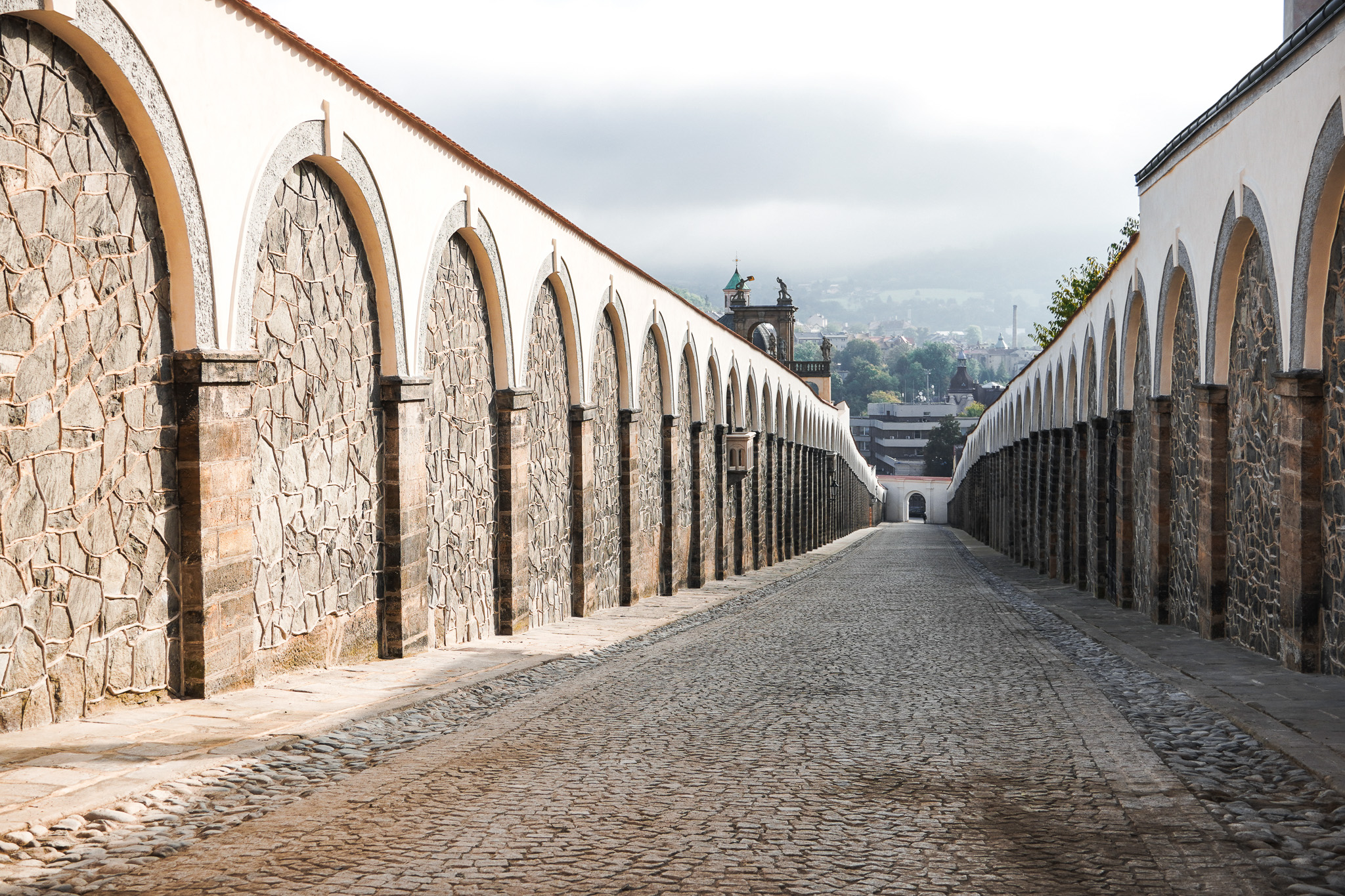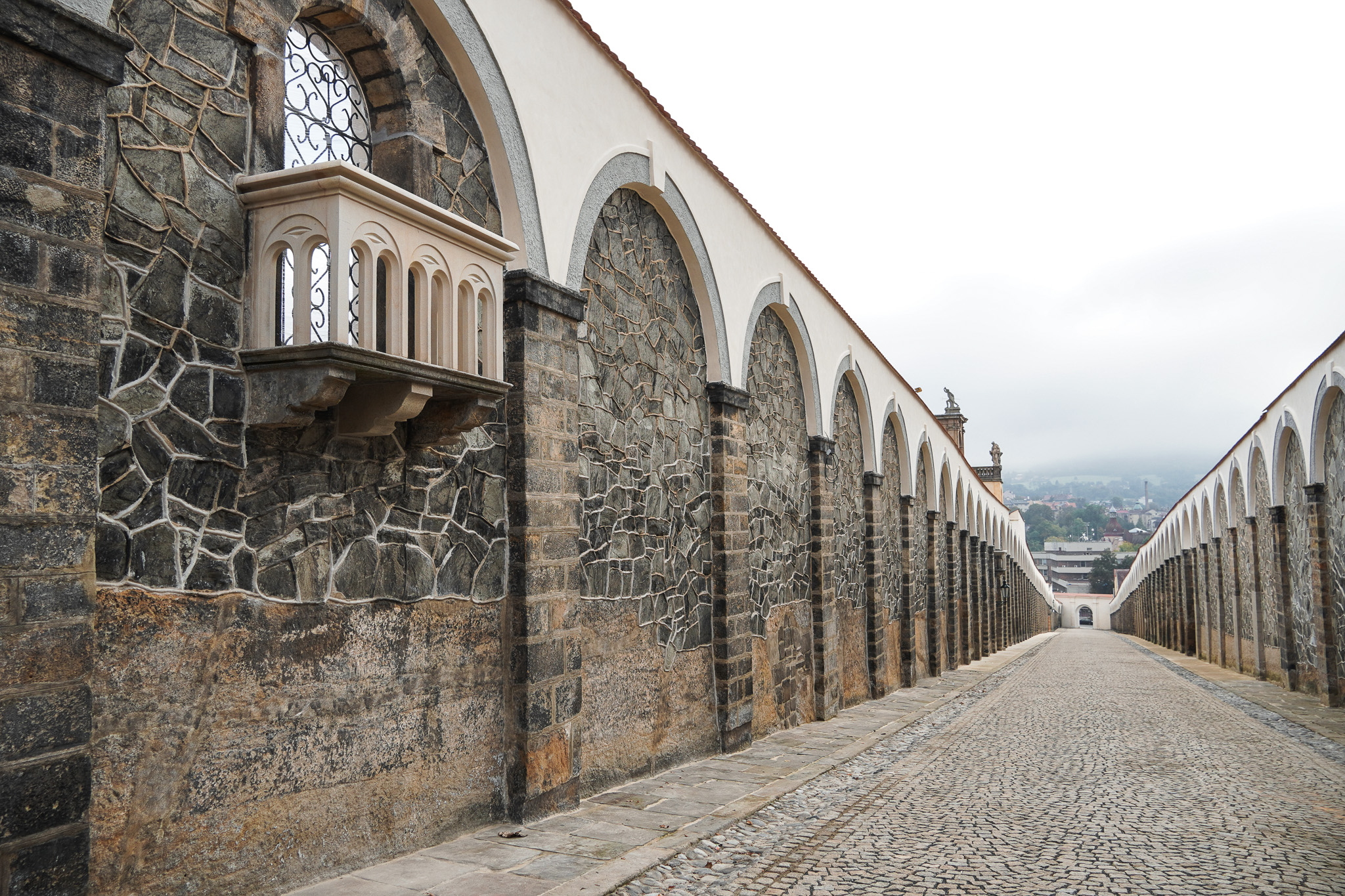 Vznikla v 70. letech 17. století za hraběte Maxmiliána Thuna jako monumentální přístupová cesta k zámku. Terén upravovali horníci z Krupky a cesta se stala osou nové zámecké kompozice. Měří 292 metrů, výška zdí je 7,5 metru, každá strana má 64 arkád. Název se objevuje už v roce 1608, stavba mohla navazovat na starší komunikaci. V 19. a 20. století prošla několika úpravami, včetně ztráty historických bran a části arkád.