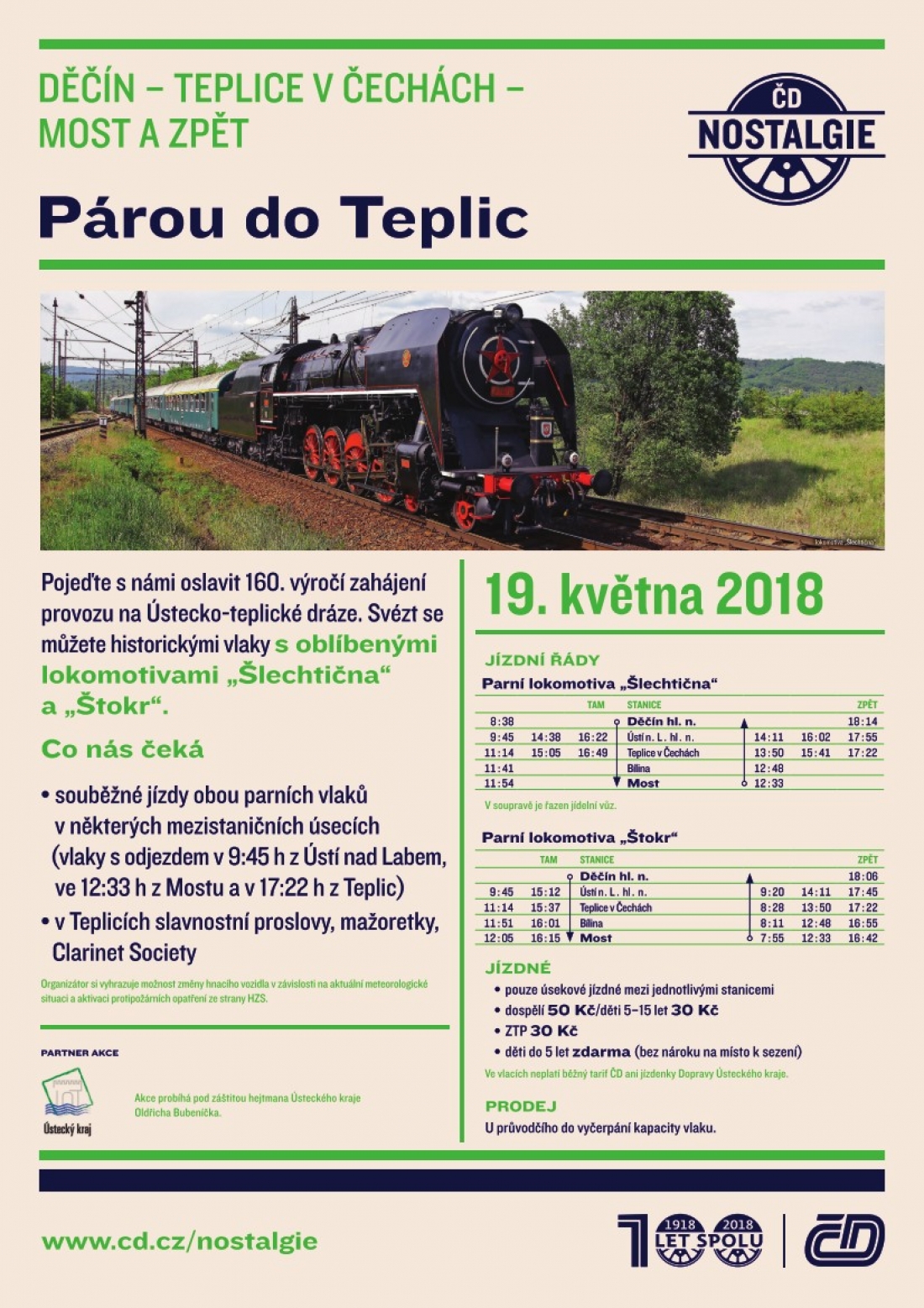 Svézt se můžete v sobotu 19. května 2018 historickými vlaky s oblíbenými lokomotivami „Šlechtična“a „Štokr“. První vlak pojede z Děčína v 8.38 hod. a po osmnácté hodině se do Děčína vrátí dvě historické soupravy tažené parními lokomotivami. Jízdy nostalgických vlaků budou doplněny jízdami muzeální elektrické jednotky EM 451.045/046.