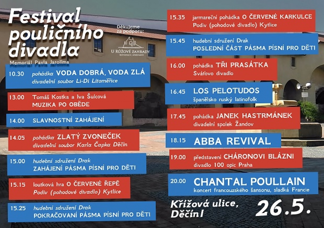 10.00 – 22.00 7. ročník festivalu Pouličního divadla – memoriál Pavla Jarolíma (Křížová ul., Děčín I) vstup zdarma