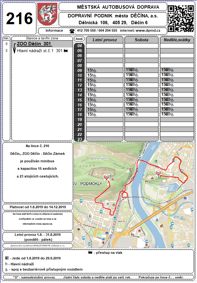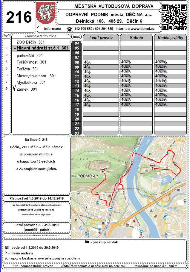 Nová turistická linka spojující Zámek a Zoo Děčín zahájí provoz 1. srpna 2019. Dopravu bude zajišťovat nízkopodlažní městský minibus s pohonem na CNG s maximální kapacitou 15 sedících a 23 stojících cestujících. Nové jízdní řády jsou k dispozici na webových stránkách DPMD,a.s. ve vyhledávači linek a spojů, kde je nutné nastavit platnost jízdního řádu k 1. 8. 2019.