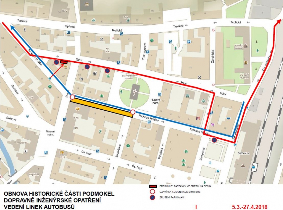 Revitalizace Podmokel začíná na ulici Prokopa Holého, a to v levé části ze směru od ulice Čsl. mládeže k ulici Ruská. Na řidiče tak čekají změny nejen v možnosti průjezdu jednotlivými ulicemi, ale také v parkování. Ulicí Tržní bude jezdit autobus ze směru od Bynova. Autobusovou zastávku z ulice Prokopa Holého najdete nyní na rohu ulic Tržní x Ruská. K dalšímu omezení řidičů dochází z důvodu rekonstrukce plynu a následně vodovodu a kanalizace v Raisově ulici, kde bude prováděna výměna plynového potrubí a stavba opěrné zdi. V dubnu pak začnou pracovat plynaři v Divišově ulici. Navazovat budou práce na rekonstrukci vodovodu a kanalizace. „Vzhledem k tomu, že ulice Divišova bude neprůjezdná a centrum přijde o nemalé množství parkovacích míst, došlo k zjednosměrnění ulice Jungmannova, a to ze směru od Mírového náměstí,“ řekla Marie Blažková, primátorka města. Díky této úpravě tak vzniklo šikmé stání a tím došlo k navýšení počtu parkovacích míst. „Lidé, kteří si pořídili parkovací karty do ulice Divišova, mohou karty vrátit nebo je mohou využít pro parkovaní v bezprostředním okolí ulice,“ vysvětlila Marie Blažková.