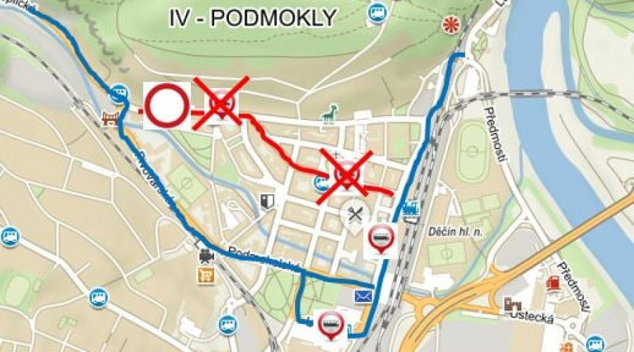 4) Zastávka Teplická směr Hlavní nádraží je přemístěna na Autobusové nádraží do stanoviště č. 8. Spoje ze zastávky U divadla pojedou po objízdné trase po ul. Pivovarská, ul. Podmokelská na Autobusové nádraží stanoviště č. 8 a dále pokračovat na Hlavní nádraží.