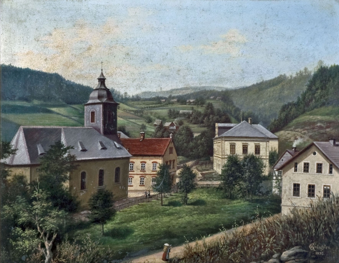 Historická fotografie zachycuje kostel v Bělé s oběma školními budovami, jak jej namaloval Raimund Gröschler v roce 1875. Před postavením kostela stávala na jeho místě kaple. Bělá byla tehdy přifařena k Rozbělesům. Teprve od roku 1852 je samostatnou farností. Kostel byl postaven známým stavitelem J. W. Koschem v letech 1787/8.