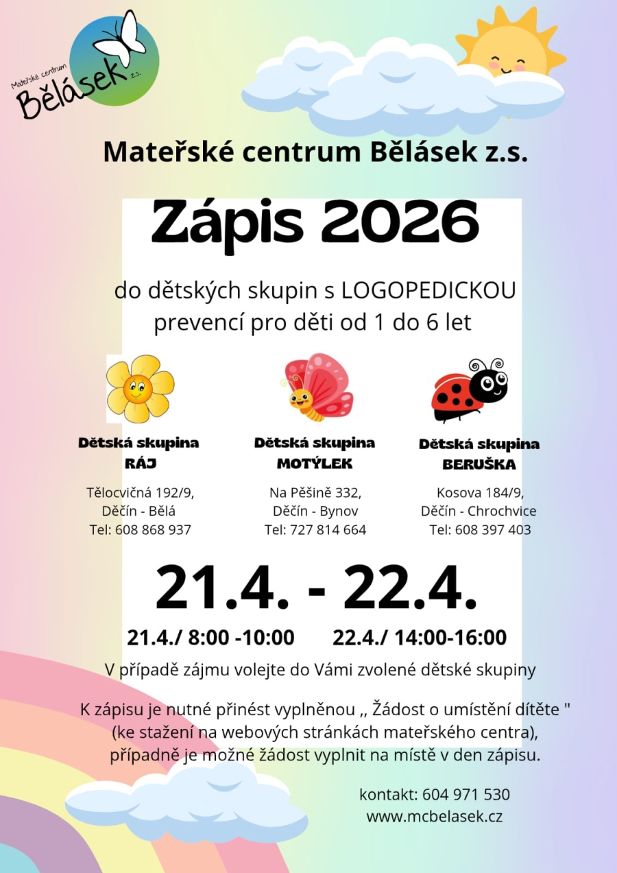 Ve dnech 21.4. - 22.4.2026 bude v našem Mateřském centru Bělásek z. s. probíhat zápis do dětských skupin s LOGOPEDICKOU prevencí pro děti od 1 do 6 let. Více informací naleznete v přiloženém letáku.