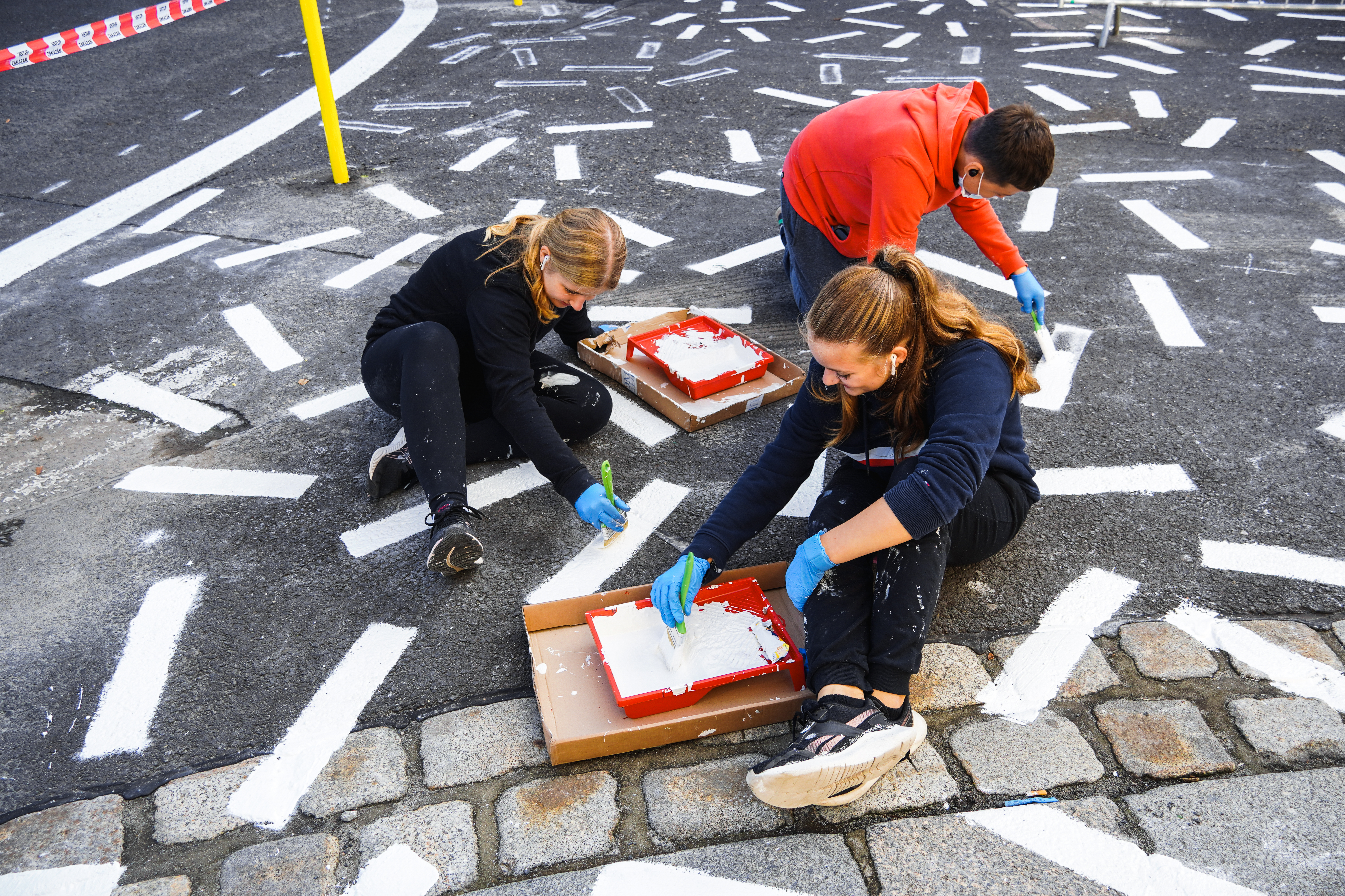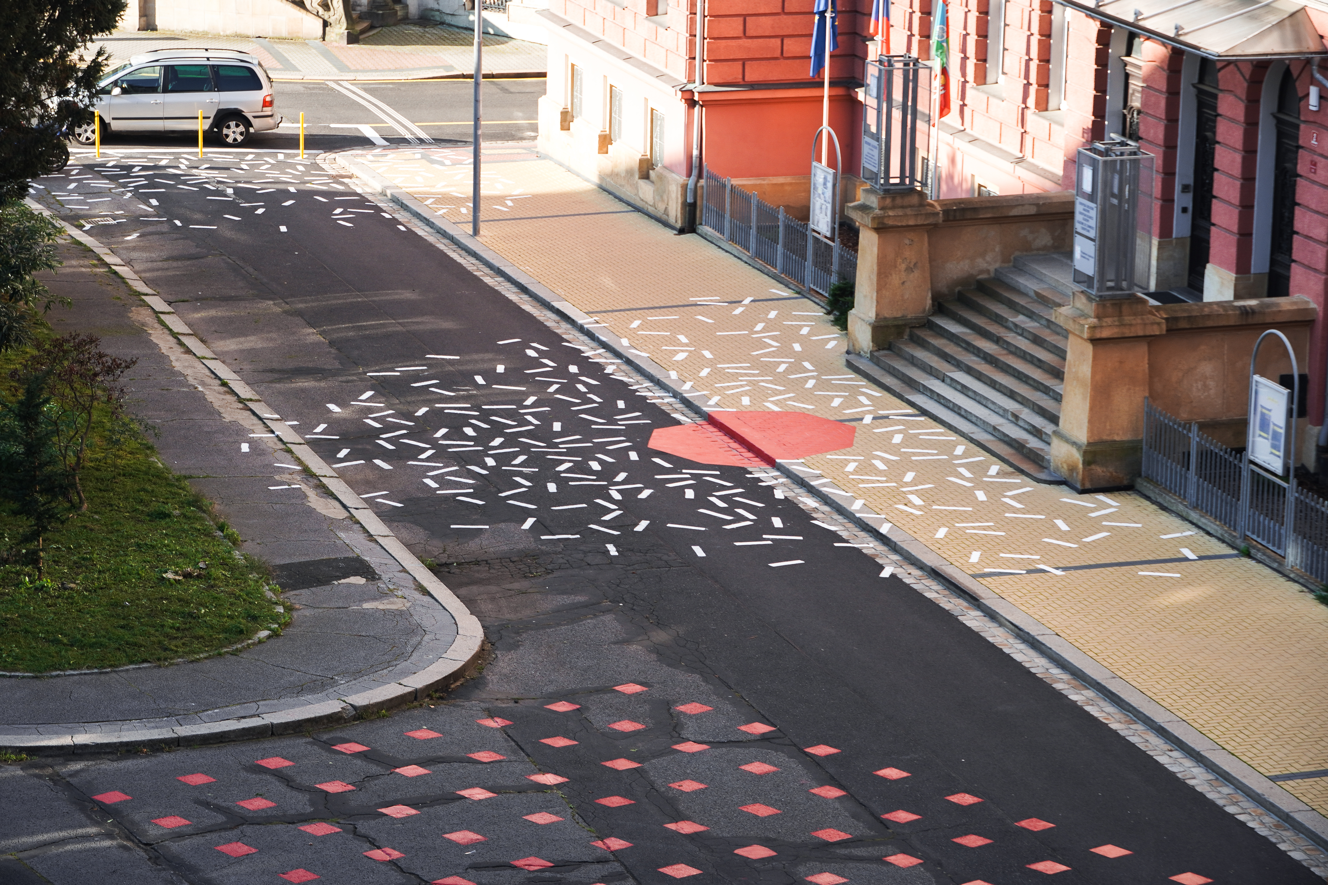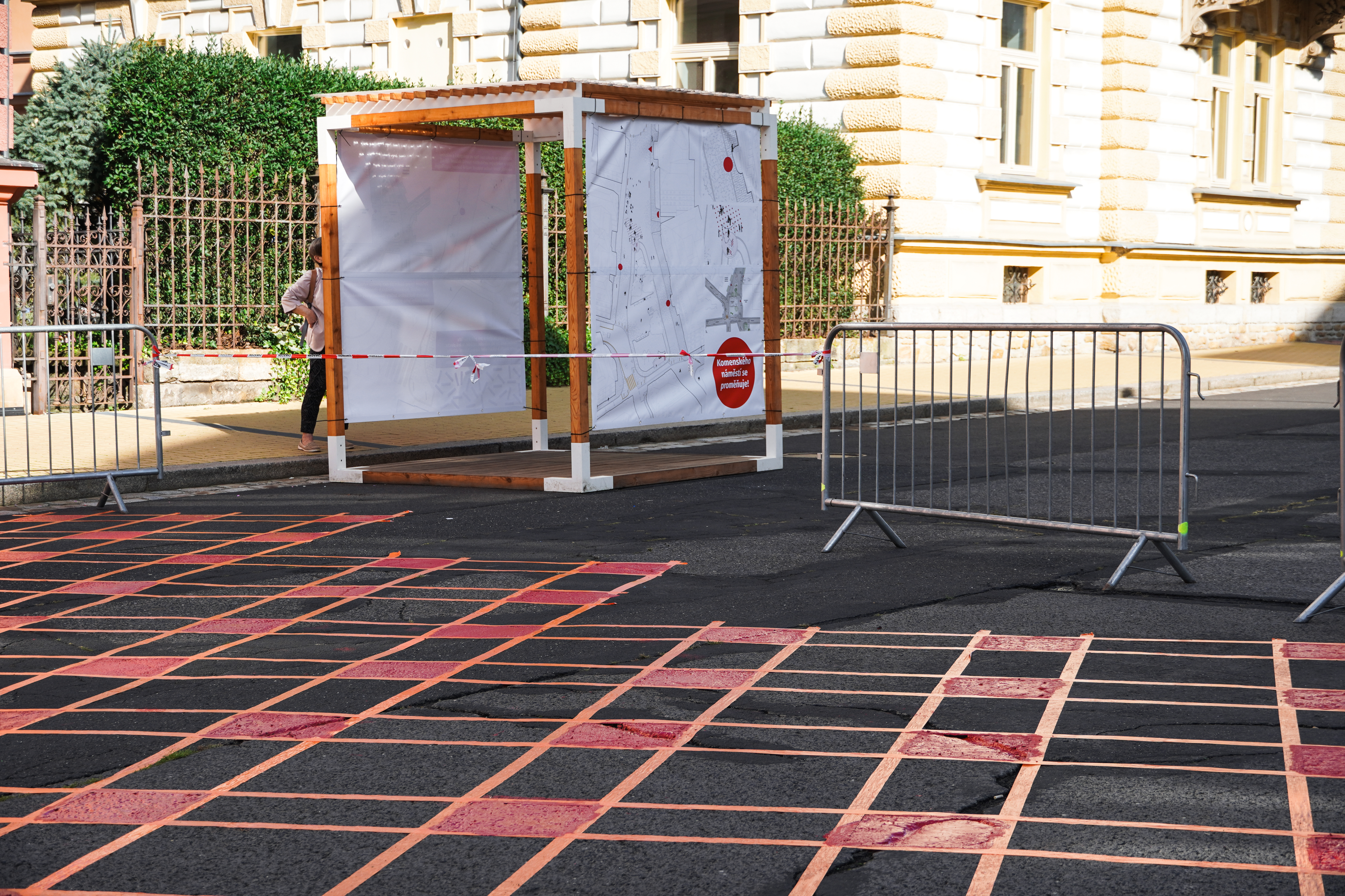 Celkový návrh dočasných úprav se skládá z pěti částí: úprav dopravního režimu, maleb na stávající povrchy, dřevěné podesty, městského mobiliáře a venkovní učebny. Minulý týden se realizovaly úpravy dopravního režimu a ve spolupráci se studenty také malby. Návrh maleb je rozdělen na dvě části. První částí jsou malby červenou barvou – jedná se o geometrické tvary před vstupy do škol a o červené čtverečky ve středu náměstí. Vstupy do škol vnímáme v rámci náměstí jako podstatná místa, jejichž význam jsme chtěli malbou podpořit. Všechny tvary jsou centrální a pravidelné, čímž symbolizují pospolitost, řád a bezpečí v rámci jednotlivých škol. Tuto část jsme se studenty realizovali již v červnu. Druhou částí návrhu jsou bílé čárky, které jsou po hranách náměstí rozeseté a mizí do ztracena. Naším cílem bylo, aby tyto čáry zvýrazňovaly nově dopravní značení a poukazovaly na jasnou hranu, za kterou je již náměstí určeno primárně pěším. Označují přechod z nebezpečného prostoru aut do bezpečného prostoru náměstí. Tuto část jsme realizovali právě minulý týden.