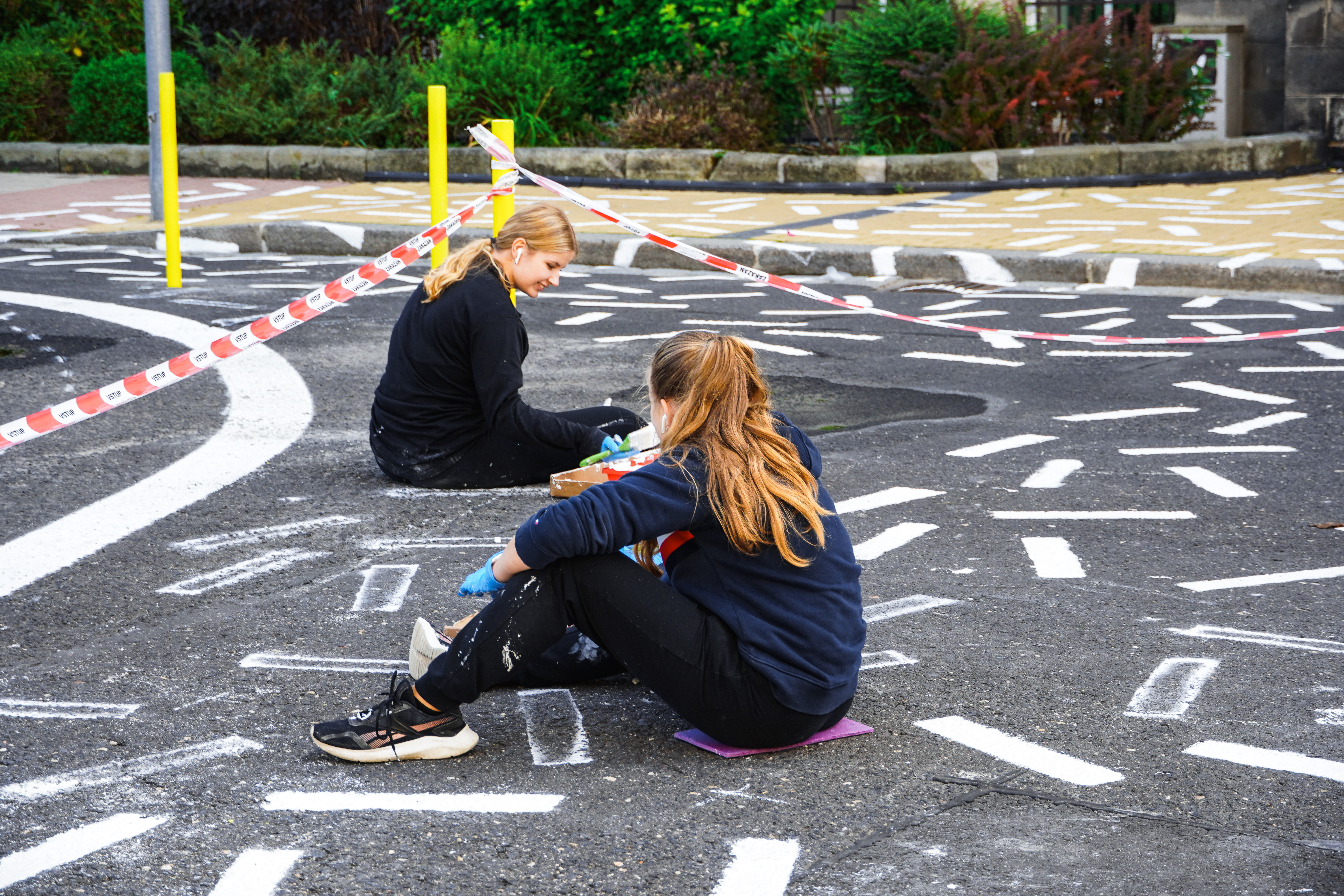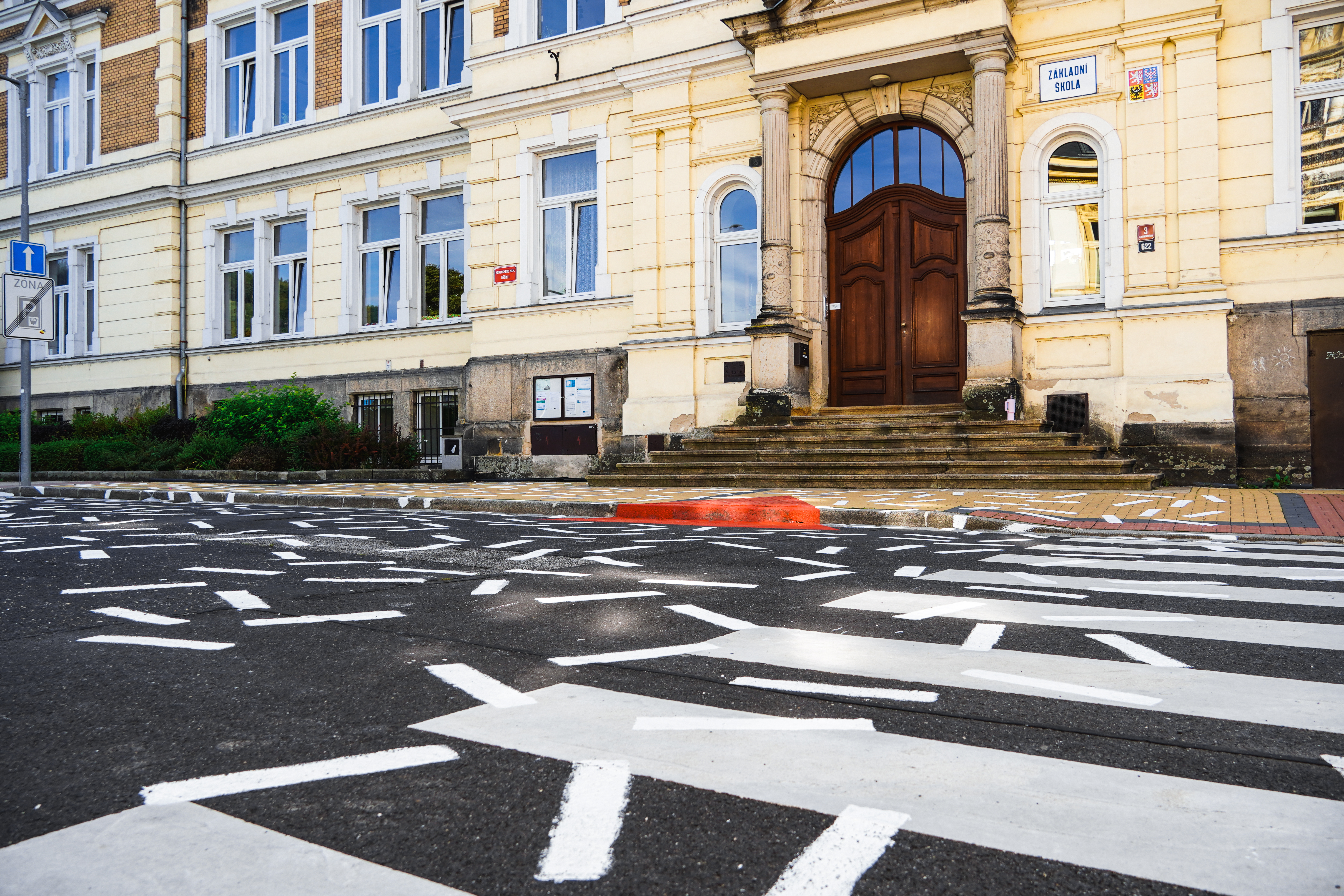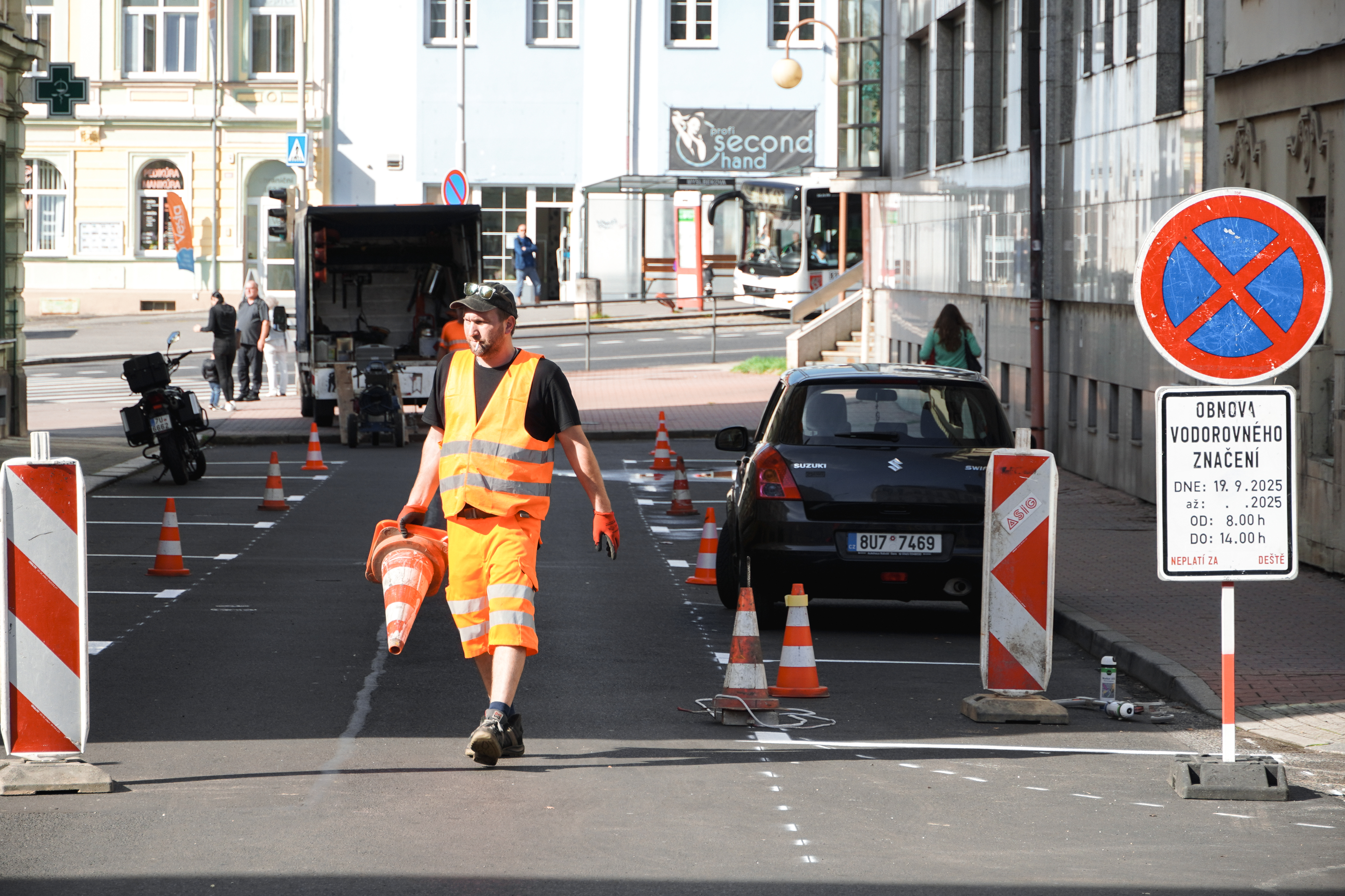 Celkový návrh dočasných úprav se skládá z pěti částí: úprav dopravního režimu, maleb na stávající povrchy, dřevěné podesty, městského mobiliáře a venkovní učebny. Minulý týden se realizovaly úpravy dopravního režimu a ve spolupráci se studenty také malby. Návrh maleb je rozdělen na dvě části. První částí jsou malby červenou barvou – jedná se o geometrické tvary před vstupy do škol a o červené čtverečky ve středu náměstí. Vstupy do škol vnímáme v rámci náměstí jako podstatná místa, jejichž význam jsme chtěli malbou podpořit. Všechny tvary jsou centrální a pravidelné, čímž symbolizují pospolitost, řád a bezpečí v rámci jednotlivých škol. Tuto část jsme se studenty realizovali již v červnu. Druhou částí návrhu jsou bílé čárky, které jsou po hranách náměstí rozeseté a mizí do ztracena. Naším cílem bylo, aby tyto čáry zvýrazňovaly nově dopravní značení a poukazovaly na jasnou hranu, za kterou je již náměstí určeno primárně pěším. Označují přechod z nebezpečného prostoru aut do bezpečného prostoru náměstí. Tuto část jsme realizovali právě minulý týden.